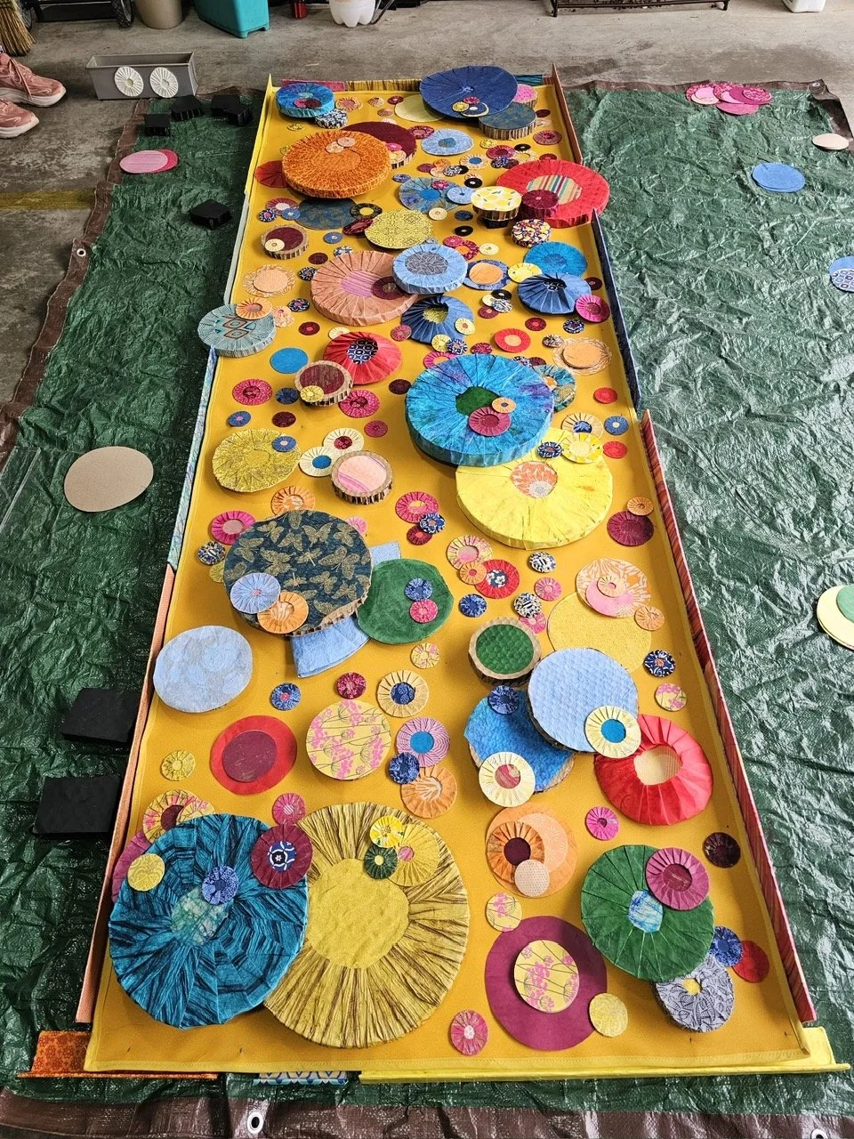 I lean more toward crafting than sewing, and I have always been drawn to paper. In 2021, these paper yo-yos emerged as a response—my way of honoring Granny with the materials that live most naturally in my hands. Making them keeps her present. Hanging this work at Bumblebirds feels like carrying my guardian angel with me.